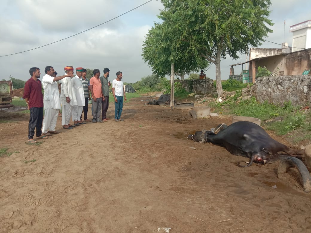 करंट की चपेट में आकर घासीराम गुर्जर की दो भैंसों की मौके पर ही मौत हो गई। हादसे में किसान को करीब तीन से चार लाख रुपये की भारी आर्थिक क्षति हुई है। न सिर्फ मवेशियों की मौत हुई, बल्कि कुंए की मोटर, स्टार और केबल भी जल गए।