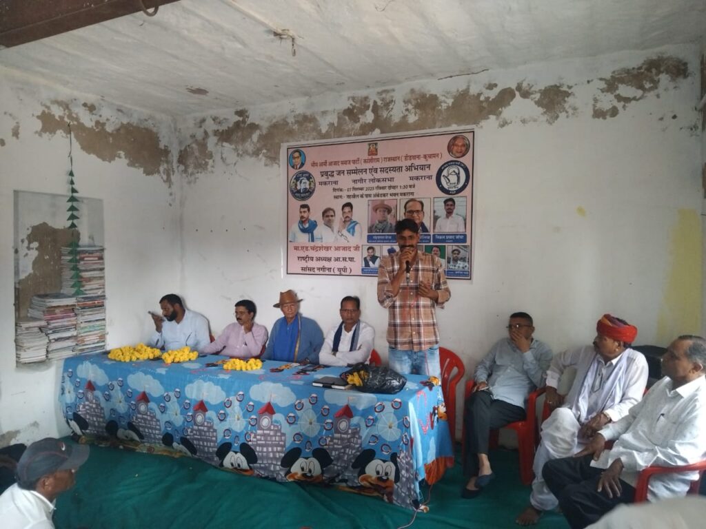 आजाद समाज पार्टी कांशीराम – राजस्थान की ओर से मकराना विधानसभा क्षेत्र में रविवार को एक अहम बैठक का आयोजन किया गया। बैठक में मुख्य अतिथि के रूप में सह-प्रदेश प्रभारी मोहनलाल बैरवा, विशिष्ट अतिथि के रूप में प्रदेश अध्यक्ष अमरचन्द हरसोलिया तथा पूर्व प्रदेश कार्यकारिणी सदस्य शंकरलाल ताड़ेडा मौजूद रहे। कार्यक्रम की अध्यक्षता भीम आर्मी के प्रदेश कार्यकारिणी सदस्य विक्रम जोया ने की।