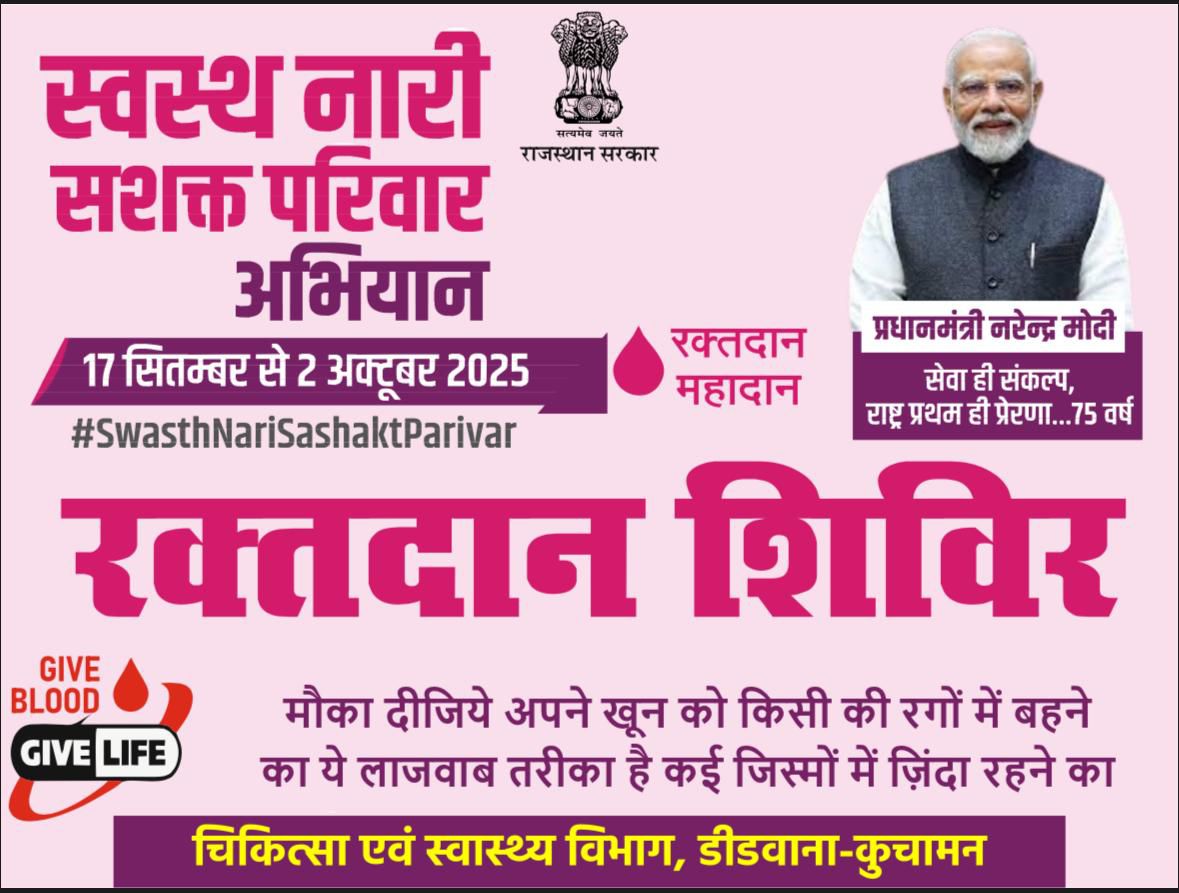 डीडवाना — कुचामन, चिकित्सा एवं स्वास्थ्य विभाग की पहल पर डीडवाना–कुचामन जिले में कल बुधवार, 17 सितम्बर से ‘स्वस्थ नारी–सशक्त परिवार अभियान’ का शुभारंभ किया जाएगा। इसका उद्घाटन प्रातः 9:30 बजे राजकीय बांगड़ जिला चिकित्सालय, डीडवाना के प्रांगण में होगा।