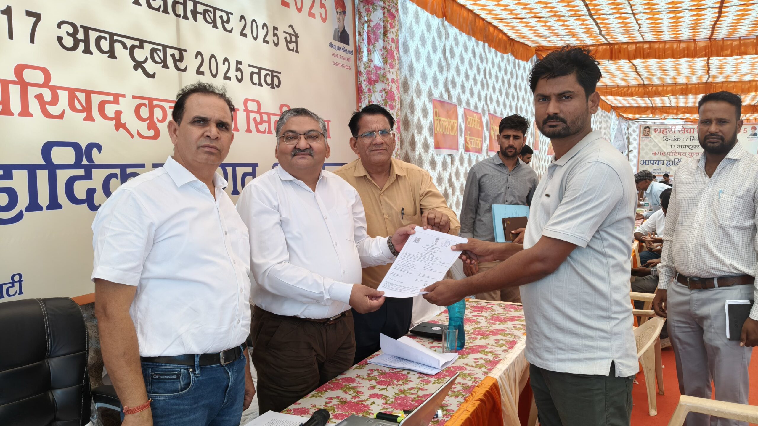 कुचामन सिटी में राज्य सरकार के निर्देशानुसार नगरपरिषद् परिसर में बुधवार को शहरी सेवा शिविर-2025 का शुभारंभ किया गया। शिविर की शुरुआत अतिरिक्त जिला कलक्टर राकेश गुप्ता और उपखंड अधिकारी विश्वामित्र मीणा की मौजूदगी में हुई, जबकि नगरपरिषद आयुक्त देवीलाल बोचल्या ने शिविर की रूपरेखा और उद्देश्य बताए।