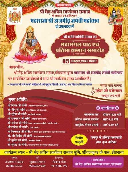 शकील अहमद उस्मानी/ श्री मैढ़ क्षत्रिय स्वर्णकार समाज, डीडवाना द्वारा समाज के आराध्य एवं आदि पुरुष महाराजा श्री अजमीढ़ की जयंती महोत्सव इस बार विशेष रंग-रूप में मनाई जाएगी। आगामी 05 अक्टूबर 2025, रविवार को डीडवाना स्थित श्री मैढ़ क्षत्रिय स्वर्णकार समाज भूमि, शीतलकुण्ड के पास दिनभर विविध कार्यक्रमों का आयोजन किया जाएगा।