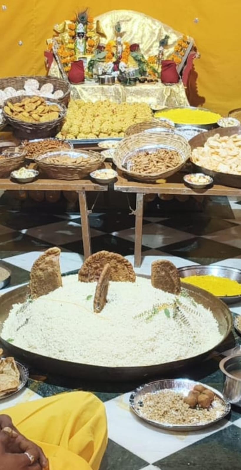कुचामन शहर के धानमंडी क्षेत्र स्थित करीब 500 वर्ष पुराने ठाकुरजी के प्राचीन मंदिर में इस बार भी अन्नकूट और छप्पन भोग महोत्सव का भव्य आयोजन किया गया। प्राचीन काल से चली आ रही इस परंपरा में ठाकुरजी को 56 प्रकार के व्यंजनों का भोग लगाया गया और विश्व कल्याण की कामना की गई। मंदिर के महंत पंडित कन्हैया लाल शास्त्री ने ठाकुरजी को नवीन धान का भोग अर्पित किया। उन्होंने बताया कि यह परंपरा राजा-महाराजा के समय से निरंतर जारी है, जब अन्नकूट के अवसर पर भगवान को विविध व्यंजनों का भोग लगाकर प्रसाद वितरण किया जाता था।