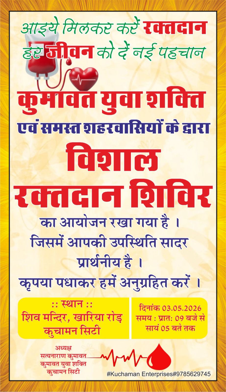 कुचामन सिटी में स्थानीय ब्लड सेंटरों में रक्त की कमी की जानकारी सामने आने के बाद कुमावत युवा शक्ति ने मानवीय पहल करते हुए 3 मई 2026 को एक विशाल रक्तदान शिविर आयोजित करने का निर्णय लिया है। इस आयोजन की जानकारी देते हुए संगठन के अध्यक्ष सत्यनारायण कुमावत ने बताया कि जरूरतमंद मरीजों को समय पर रक्त उपलब्ध हो सके, इसी उद्देश्य से यह कदम उठाया गया है।