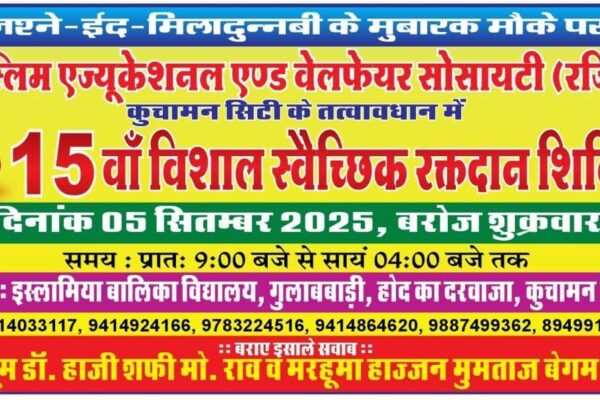 जश्ने-ईद-मिलादुन्नबी के मुबारक मौके पर कल मुस्लिम एज्यूकेशनल एण्ड वेलफेयर सोसायटी (रजि.) कुचामन सिटी के तत्वावधान में 15वां विशाल स्वैच्छिक रक्तदान शिविर आयोजित किया जाएगा। शिविर आगामी सुबह 9 बजे से सायं 4 बजे तक इस्लामिया बालिका विद्यालय, गुलाबबाड़ी, होद का दरवाजा, कुचामन सिटी में आयोजित होगा। यह शिविर मरहूम डॉ. हाजी शफी मोहम्मद राव और मरहूमा हाज्जन मुमताज बेगम राव की स्मृति में उनके सुपुत्र डॉ. मोहम्मद सलीम राव के सौजन्य से आयोजित हो रहा है । डॉ राव पिछले कई साल से ये…